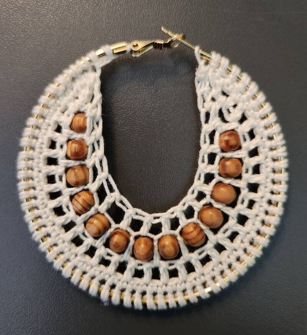 Créoles entièrement crochetées à la main agrémentées de perles de bois. Plusieurs tailles et coloris disponibles.